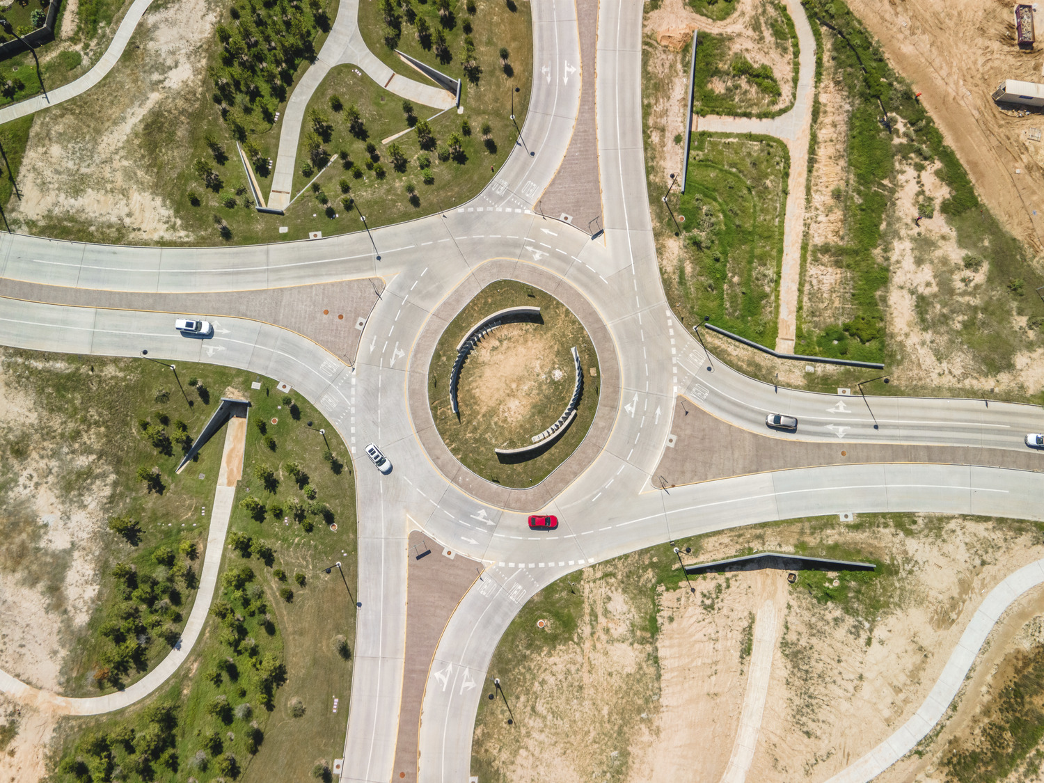 To facilitate flow and eliminate head-on collisions, this four-lane boulevard exclusively features roundabouts at nine intersections.